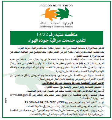מכרז פומבי מס' 13/22 לבחירת ספק לביצוע בקרת נתוני ניטור אוויר