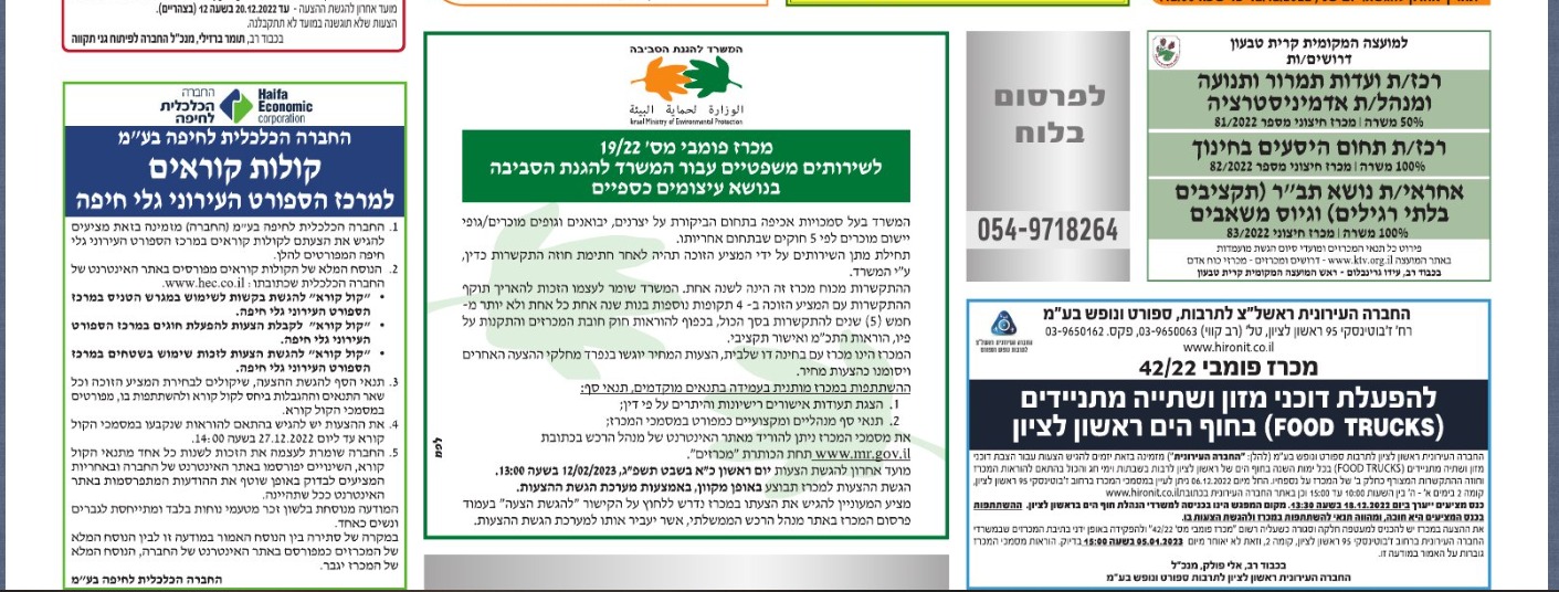 מכרז פומבי 19/22 לשירותים משפטיים עבור המשרד להגנת הסביבה בנושא עיצומים כספיים