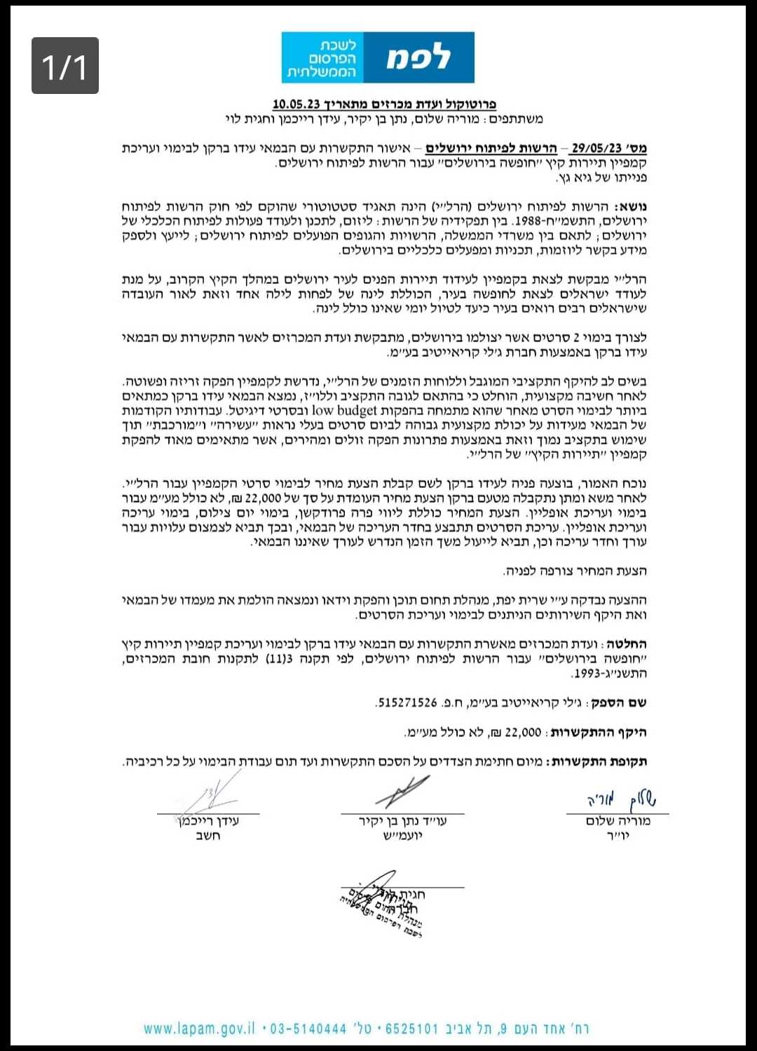 התקשרות עם הבמאי עידו ברקן לבימוי ועריכת קמפיין תיירות קיץ "חופשה בירושלים" עבור הרשות לפיתוח ירושלים.