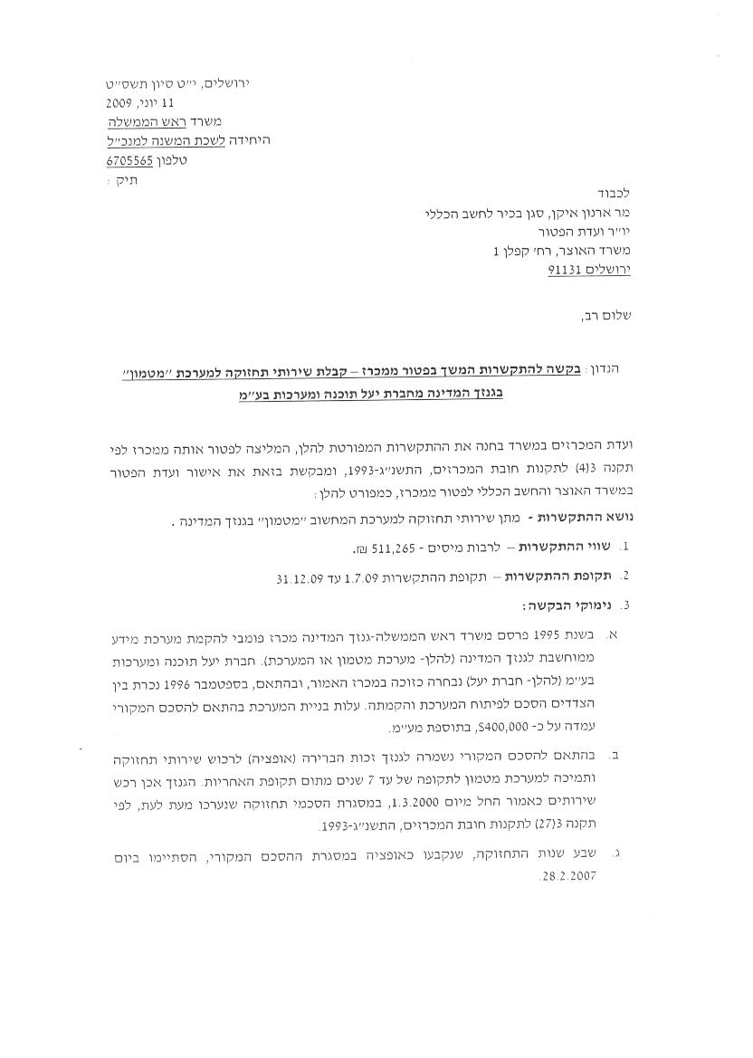 בקשה להתקשרות המשך בפטור ממכרז - קבלת שירותי תחזוקה למערכת מטמון בגנזך המדינה מחברת יעל תוכנה ומערכות בעמ