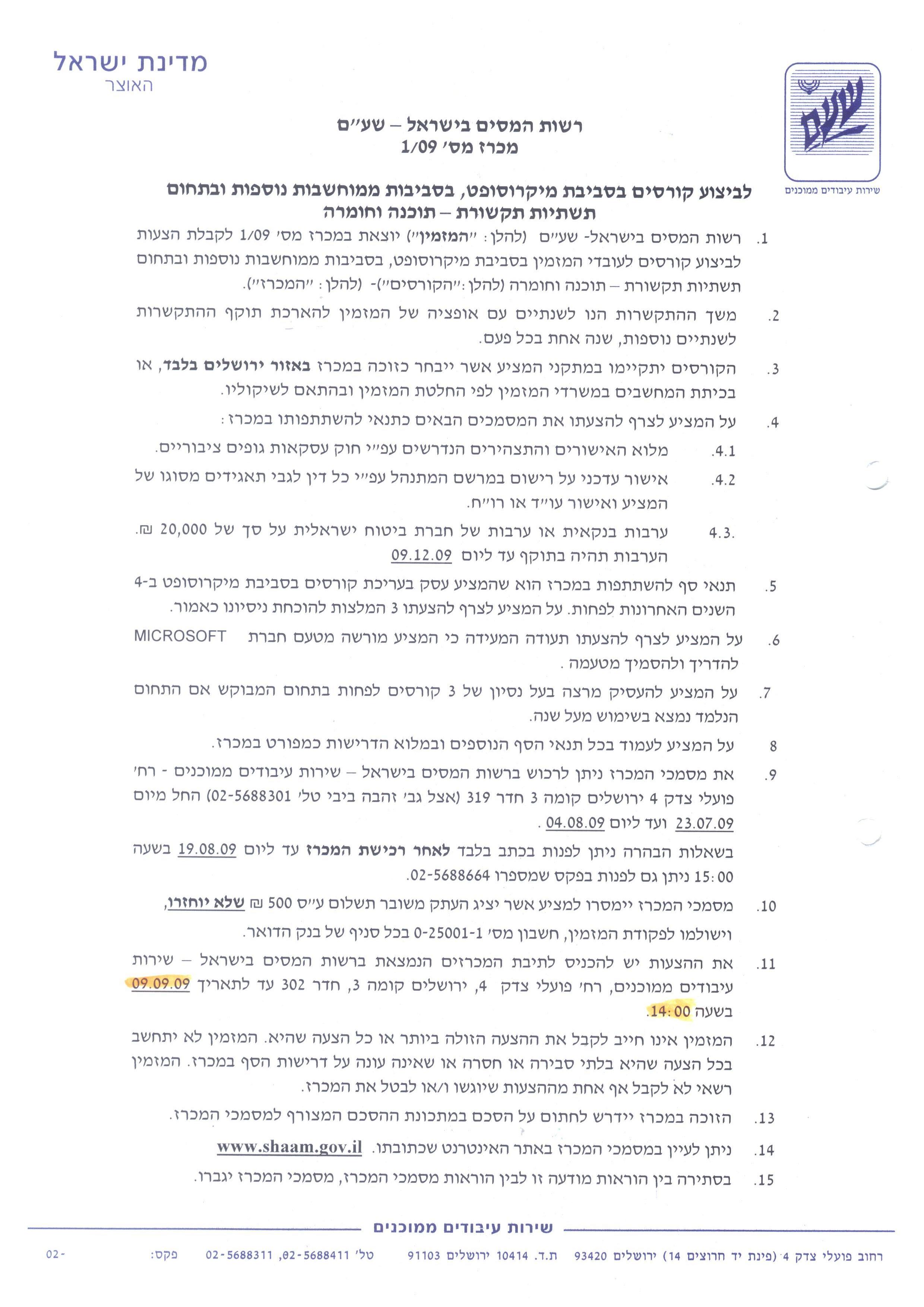 מכרז מס' 1/09 לביצוע קורסים בסביבת מיקרוסופט - בסביבות ממוחשבות נוספות ובתחום תשתיות תקשורת -תוכנה וחומרה