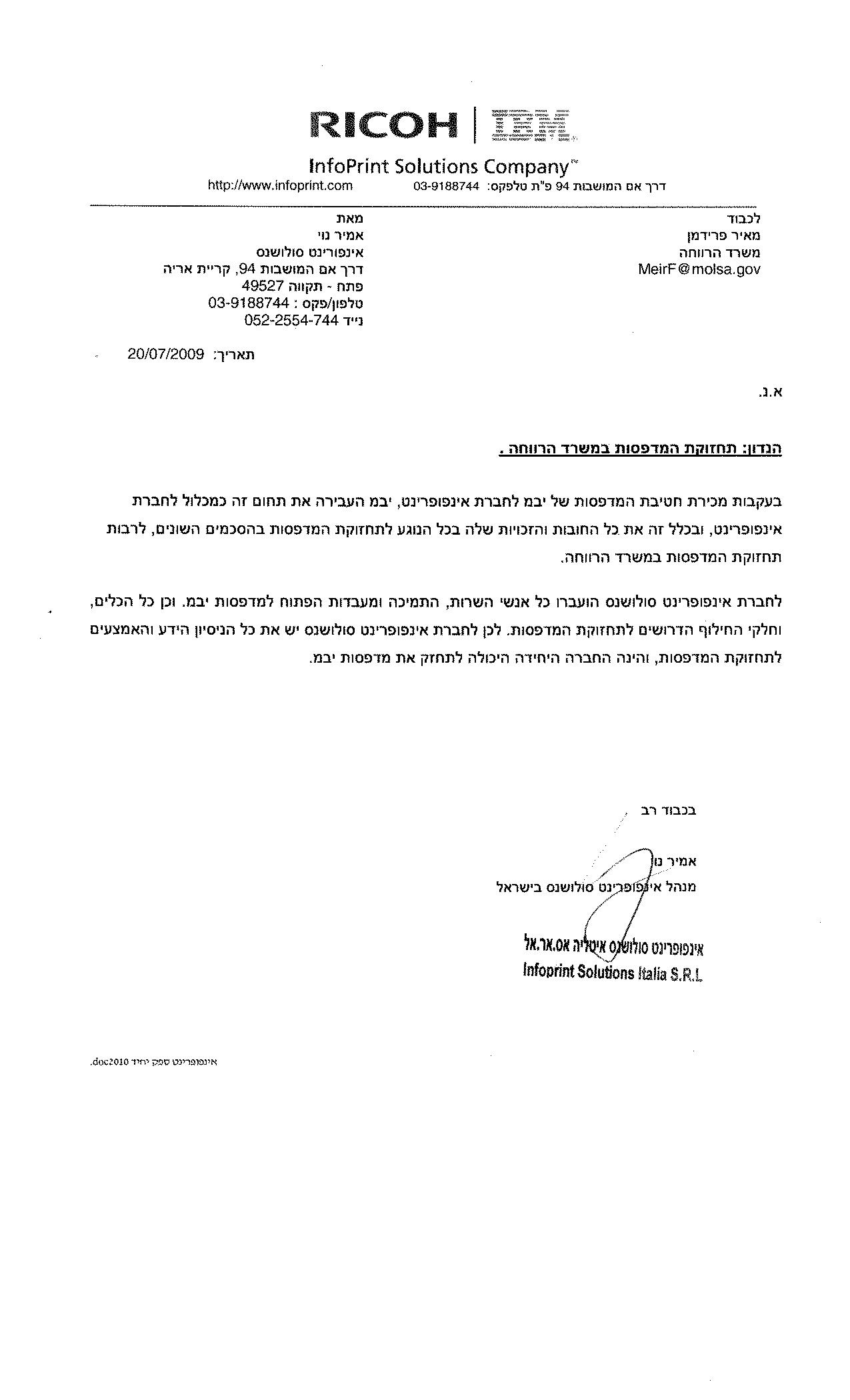 משרד הרווחה והשירותים החברתיים מעוניין להתקשר עם חברת אינפו פרינט סולושנס איטליה, SRL לצורך תחזוקת מדפסות י.ב.