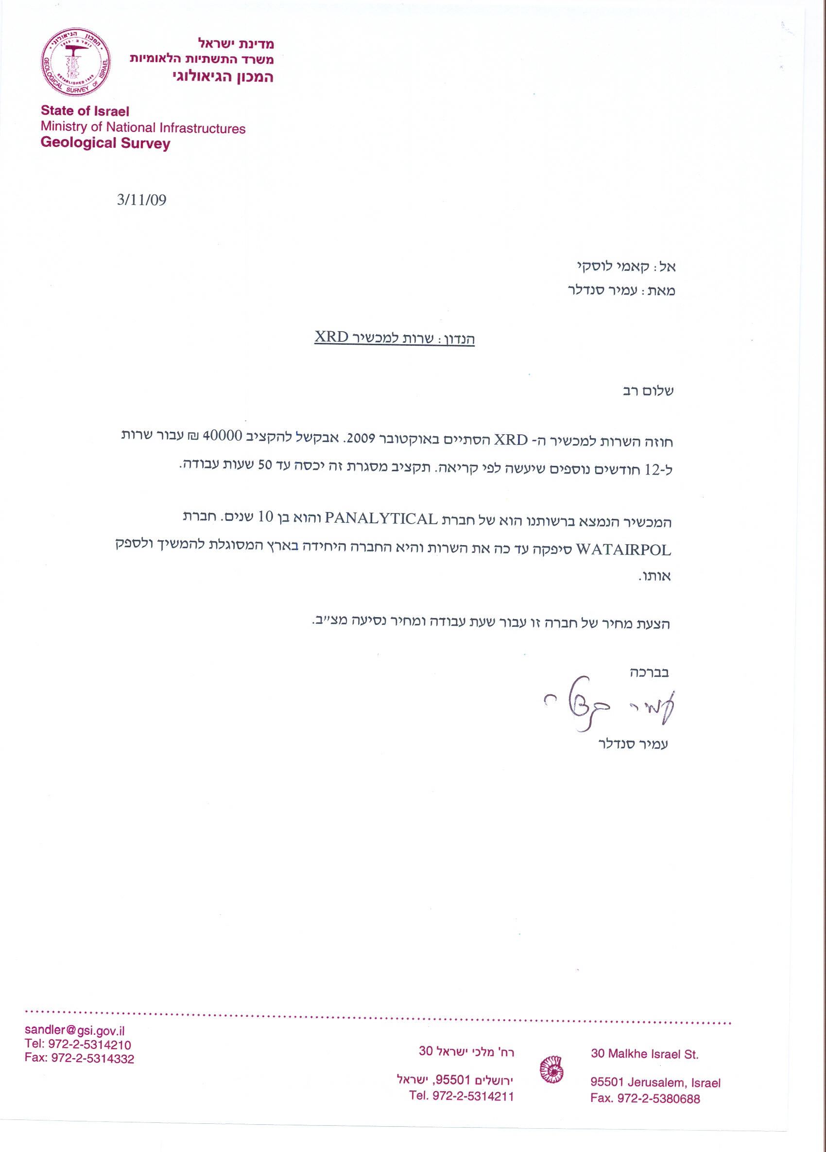 שרות תחזוקה למכשיר XRD- תוצרת PANALYTICAL בן 10 שנים.הזמנת מסגרת עס 40,000 שח לפי דוח עבודה בפועל (מאושר ע