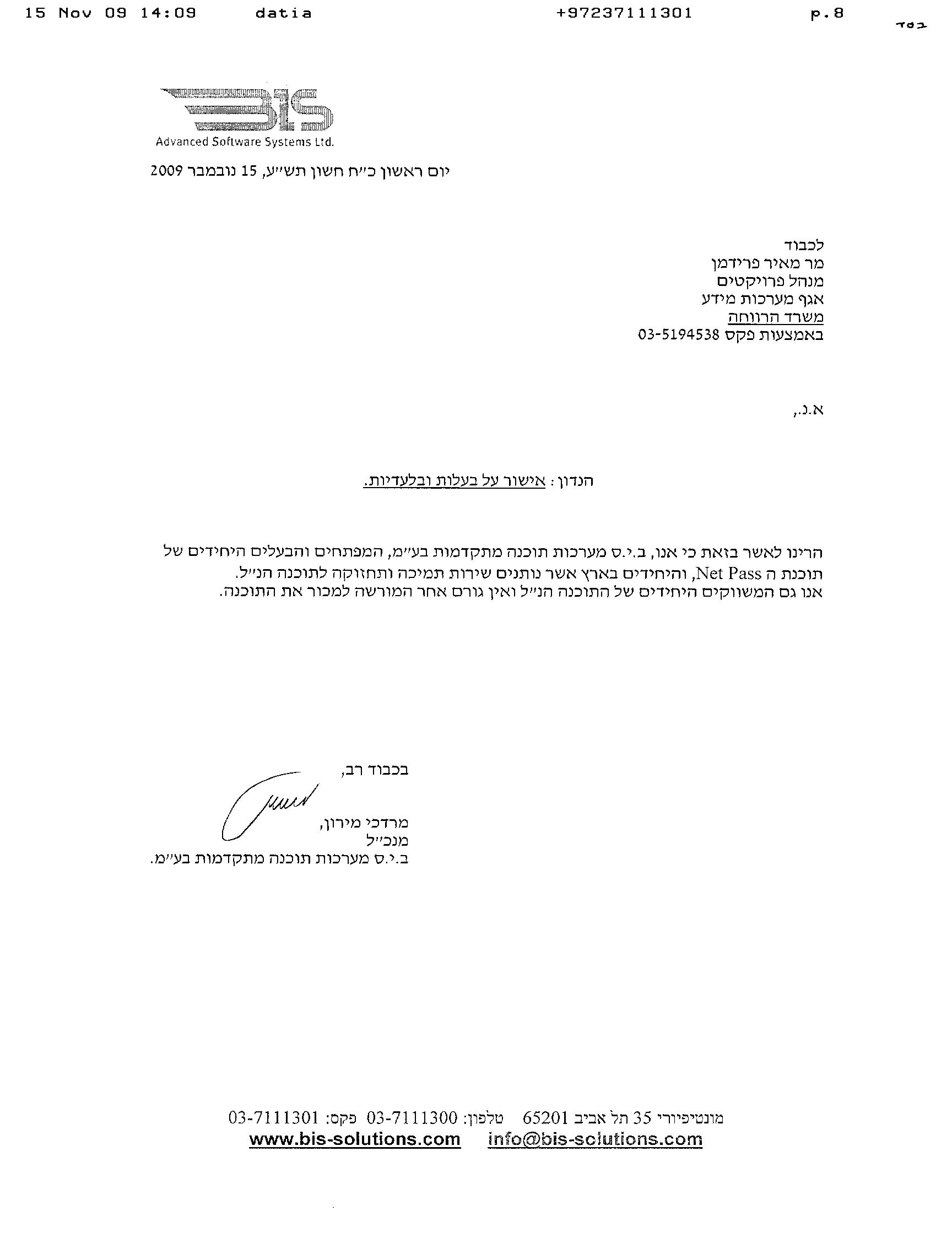 משרד הרווחה והשירותים החברתיים מעוניין להתקשר עם חברת BIS לצורך רישוי שימוש בתוכנות עבור המחשב המרכזי (MF).