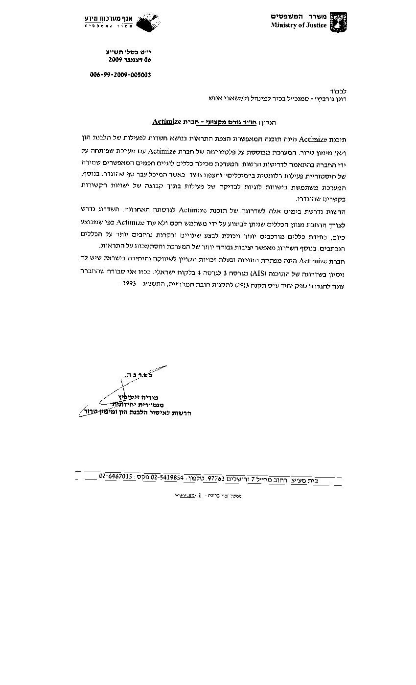 התקשרות עם חברת Actimize לשדרוג תוכנת Actimize מגרסה 3 לגרסה 4 ברשות לאיסור הלבנת הון