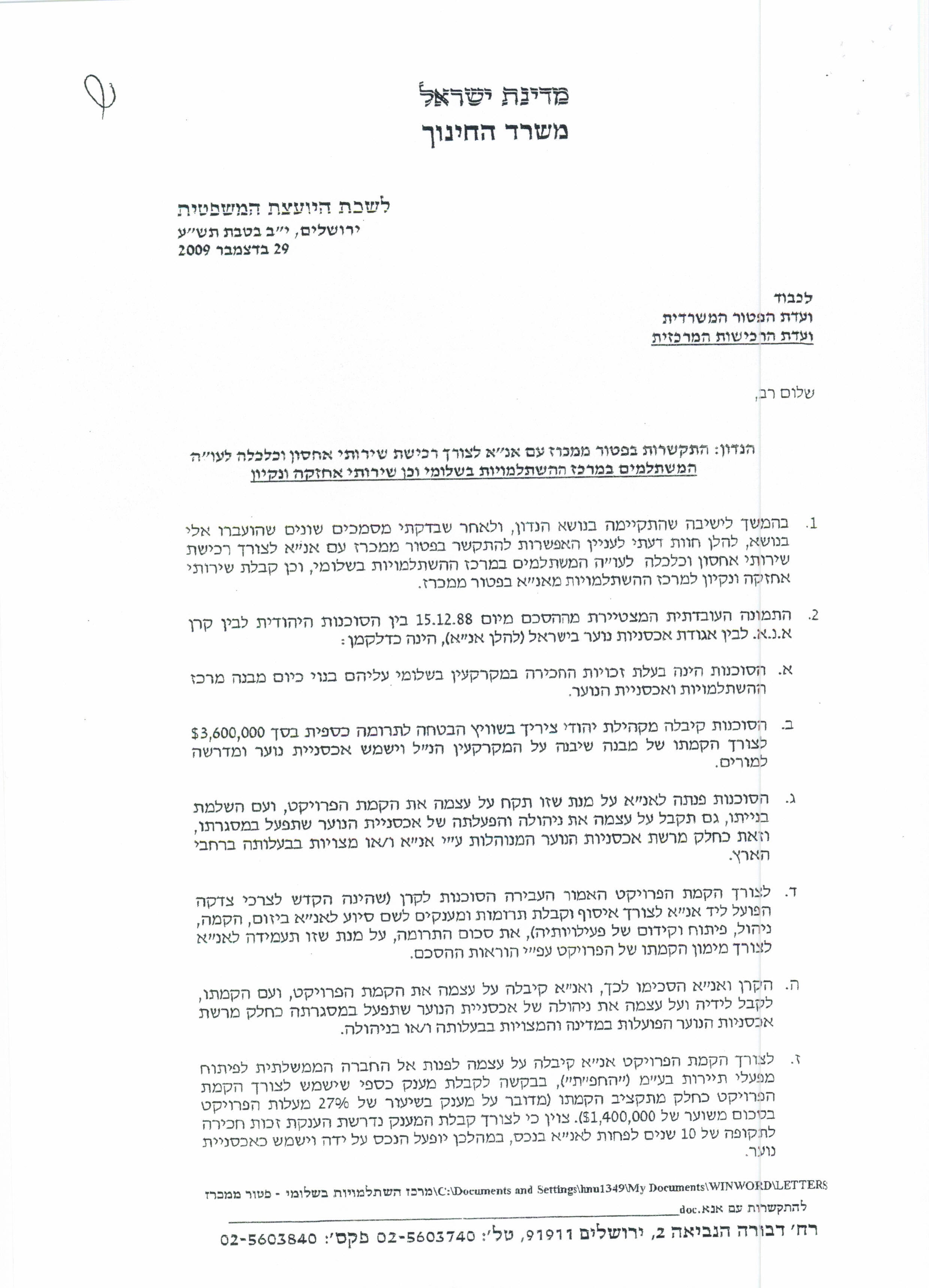 התקשרות עם אנא כספק יחיד, לרכישת שירותי כלכלה ותחזוקה למרכז בשלומי.