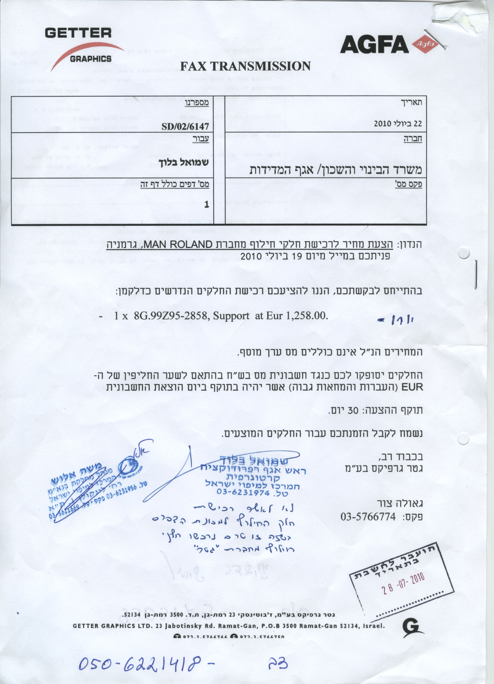 רכישת חלקים למכונת דפוס מסוג ROLAND