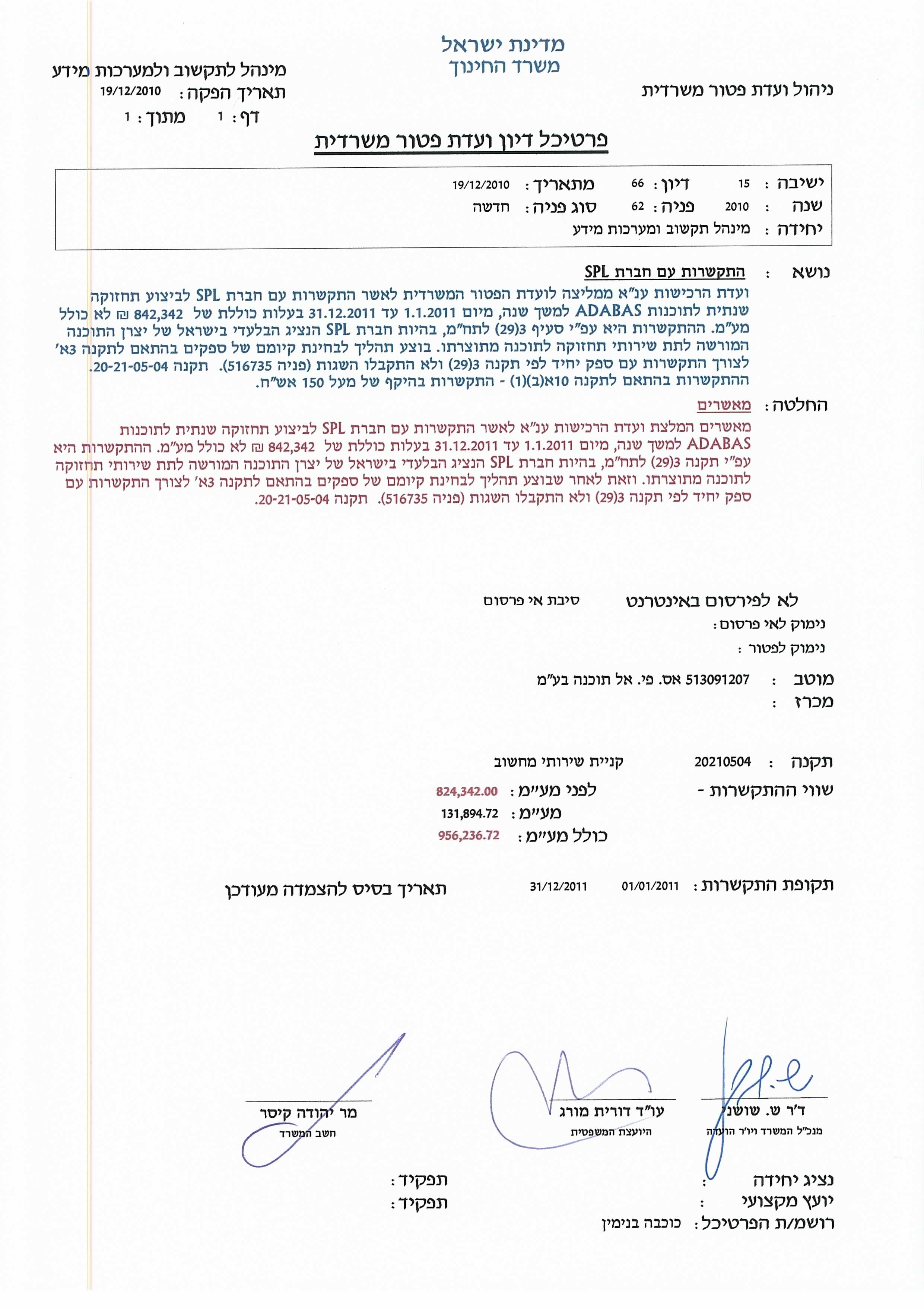 התקשרות עם חברת SPL לביצוע תחזוקה שנתית לתוכנות ADABAS - כספק יחיד.
