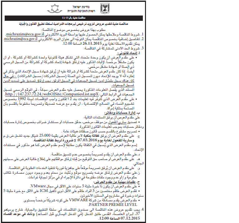 מכרז פומבי 11/15 לאספקת רישוי לתכנת וירטואליזציה לרשות האכיפה והגבייה