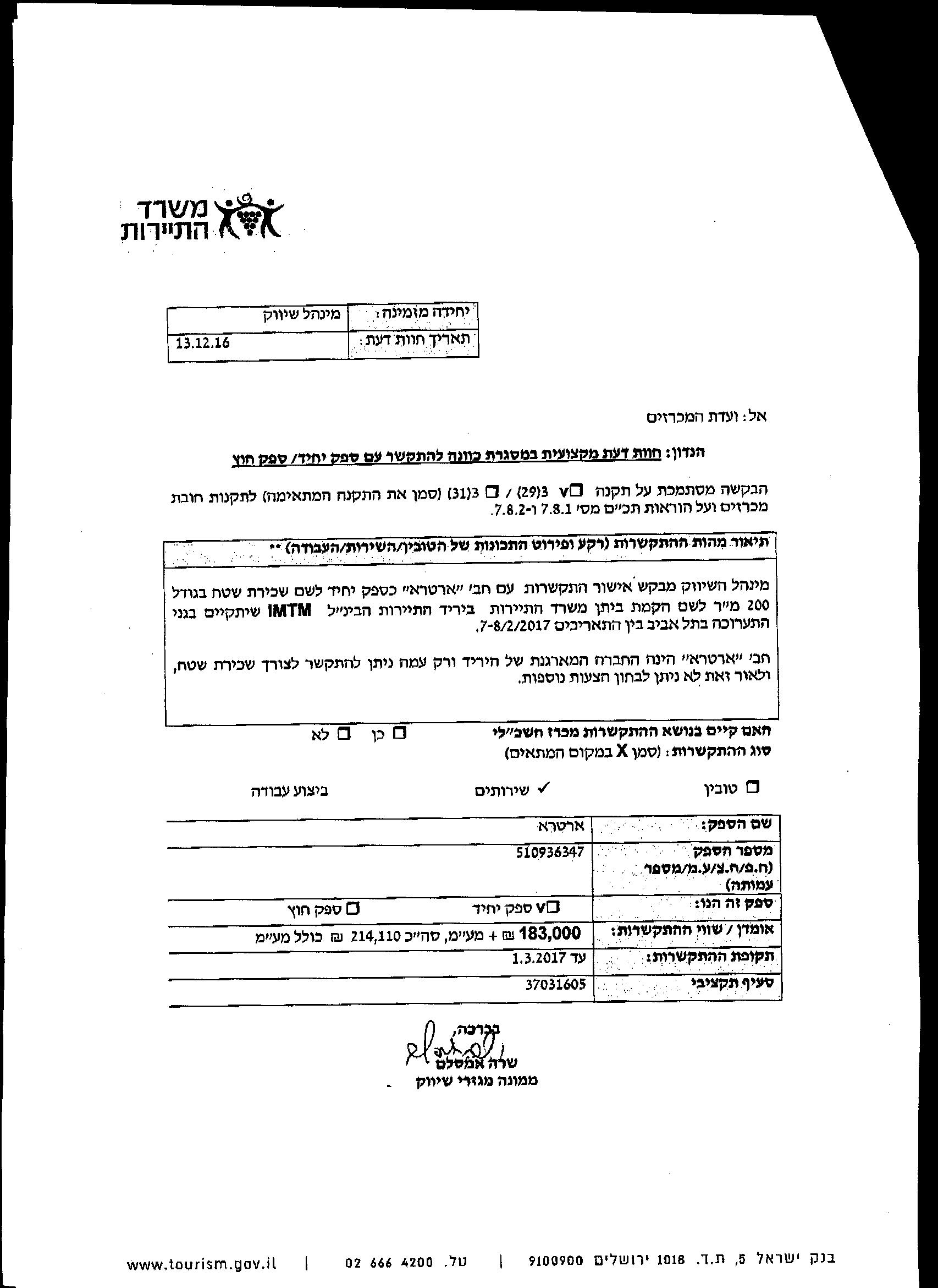 התקשרות עם חברת ארטרא לשם שכירת שטח להקמת ביתן משרד התיירות ביריד IMTM2017