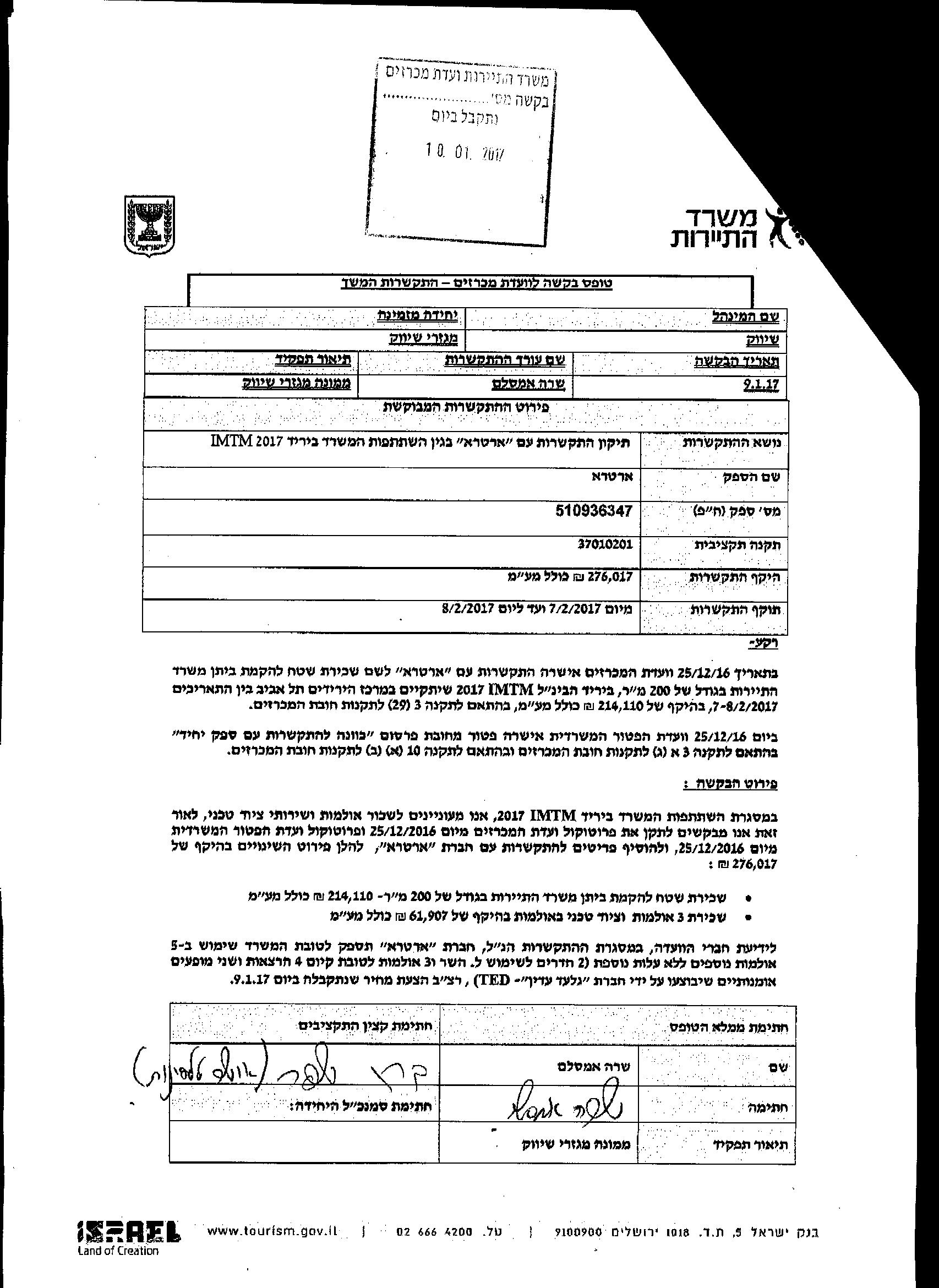 תיקון התקשרות עם ארטרא לשם שכירת שטח להקמת ביתן משרד התיירת ביריד IMTM 2017