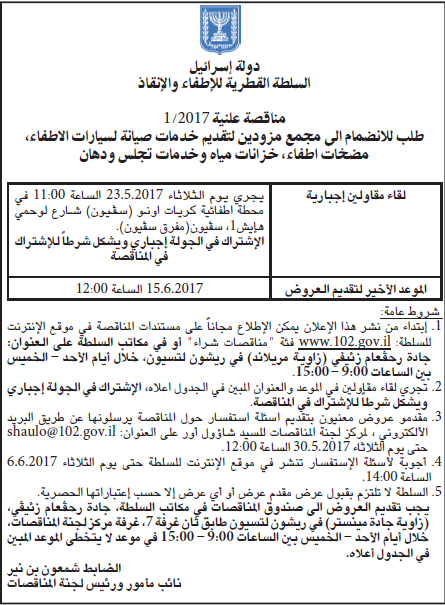 בקשה להיכלל במאגר ספקים למתן שירותי אחזקת שבר למרכבי רכבי כיבוי, משאבות כיבוי, מכלי מים ושירותי פחחות וצבע