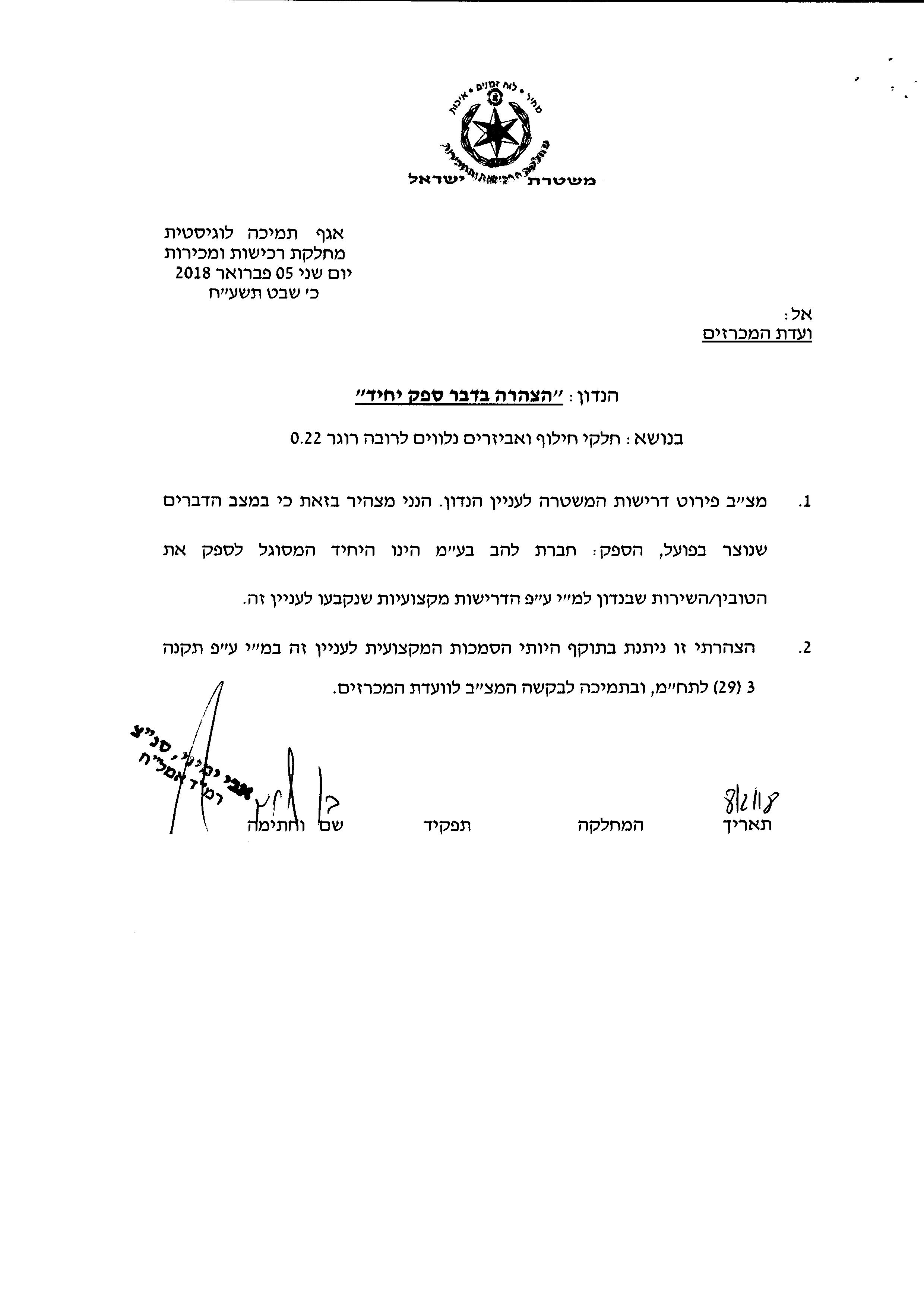משטרת ישראל מעוניינת לרכוש מהספק הנל חלקי חילוף ואביזרים נלווים לרובה מסוג RUGER 0.22. הספק הנל הינו הנציג ה
