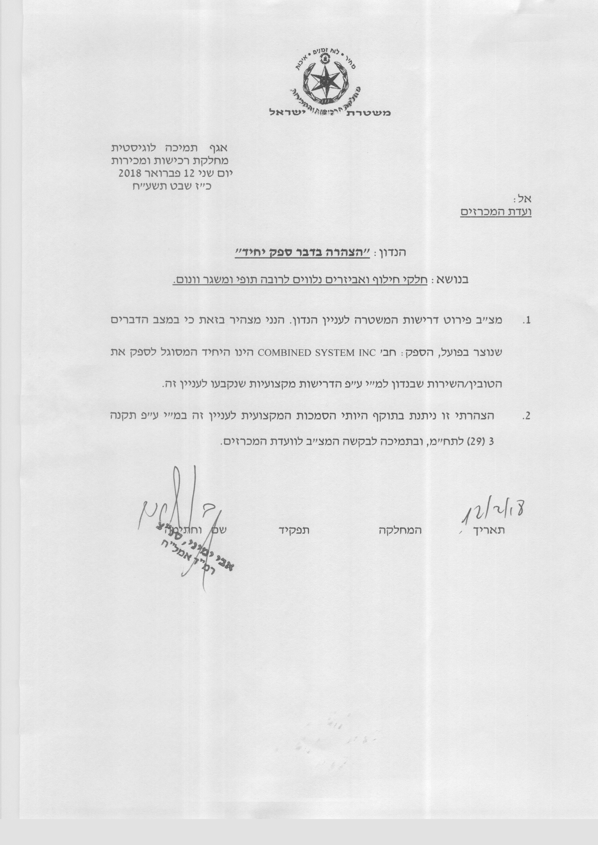 משטרת ישראל מבקשת להתקשר בפטור עם חברת מ.ר הנטר בעמ לצורך רכש חלקי חילוף ותחזוקה לרובה תופי ומשגר וונום ה