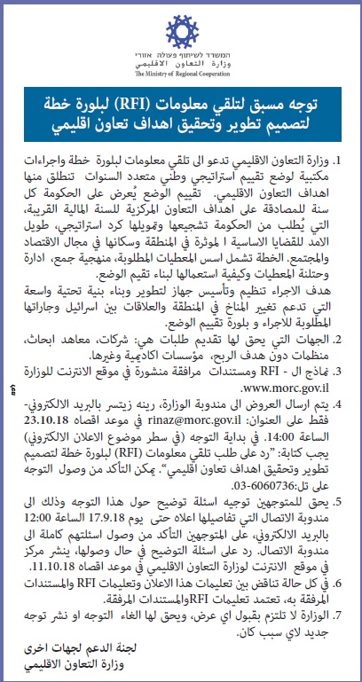 פנייה מוקדמת לקבלת מידע (RFI) לגיבוש תכנית לעיצוב קידום ומימוש יעדי שיתוף פעולה אזורי