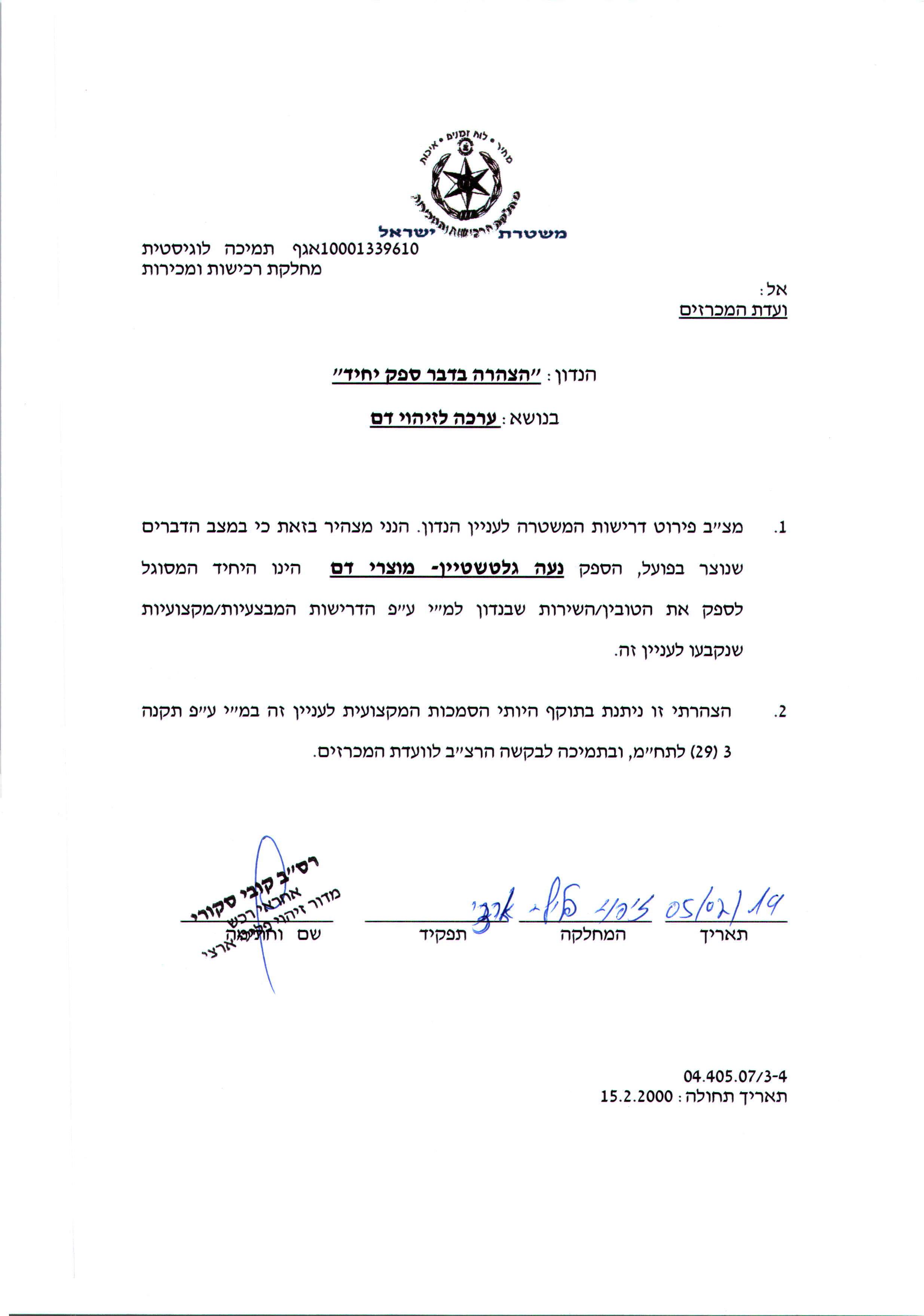 משטרת ישראל מעוניינת להתקשר עם הספק הנל לטובת רכישת ערכות לזיהוי דם המתאימות לצרכי יחידות שטח
