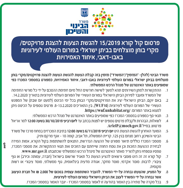 קול קורא 15/2019 להגשת הצעות להצגת פרויקטים/מקרי בוחן מוצלחים בביתן ישראלי בפורום העולמי לעירוניות באבו דאבי,