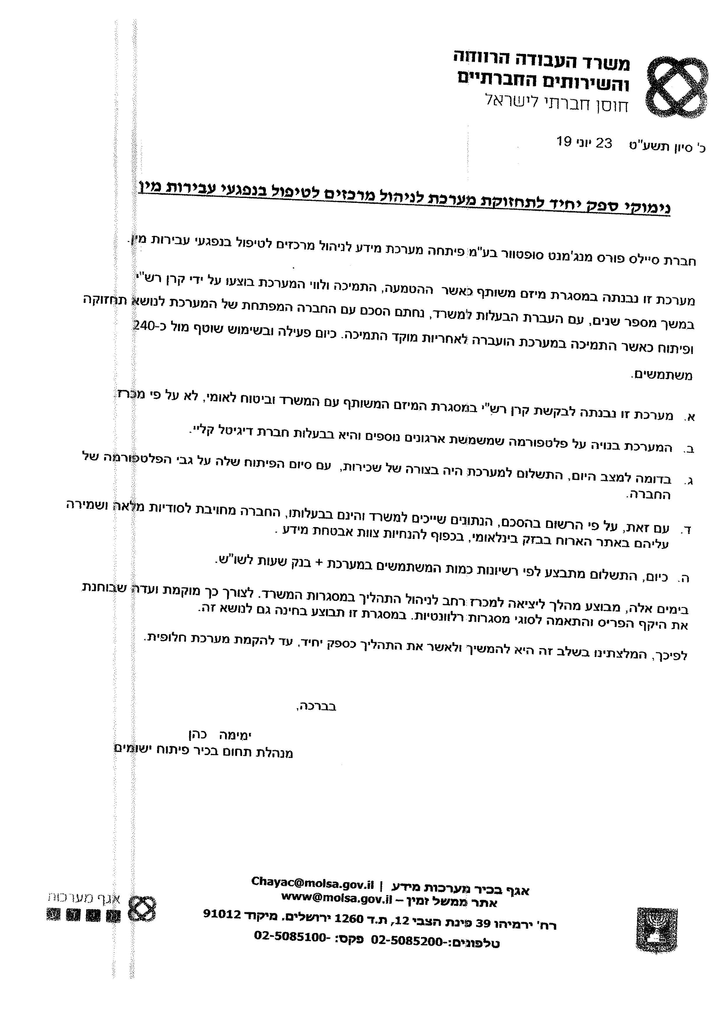 התקשרות עם חברת סיילס פורס מנג'מנט (דיגיטל קליי) (ח.פ. 513455667) לתחזוקת מערכת ניהול מרכזים לטיפול בנפגעי עבי